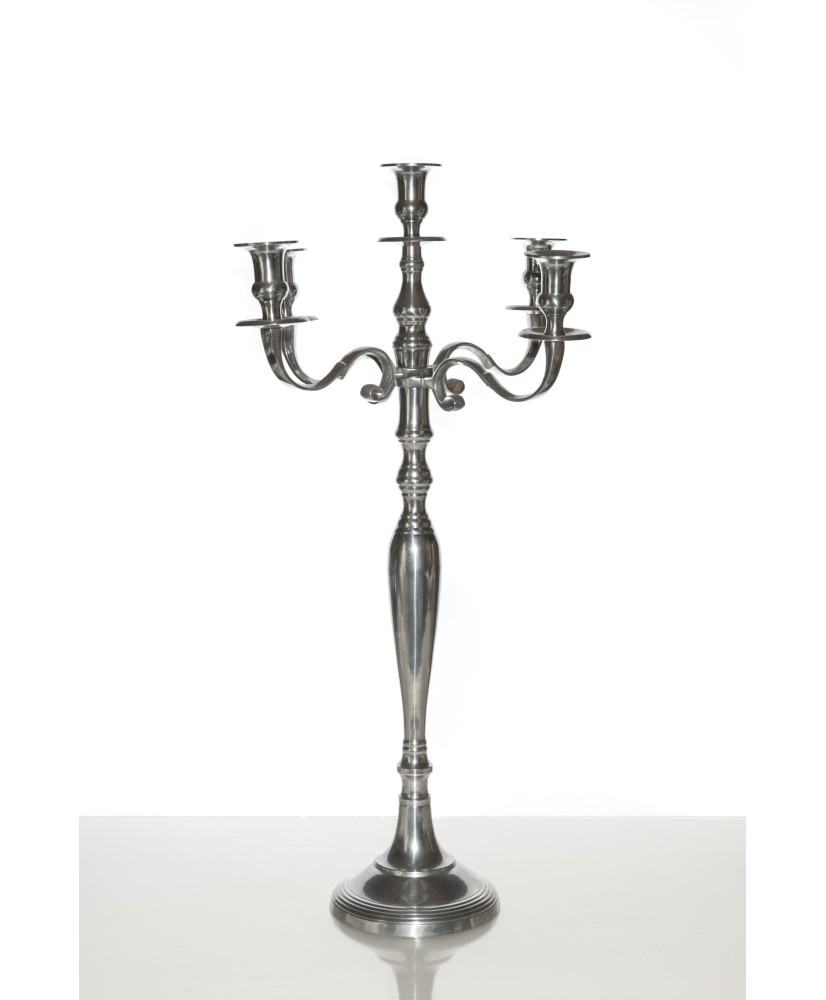 Sublimez vos tables et décors avec ce chandelier en métal argenté au design classique et élégant. Doté de cinq bras, il accueille des bougies longues pour créer une ambiance chaleureuse et raffinée, idéale pour les mariages, dîners de gala ou événements prestigieux.